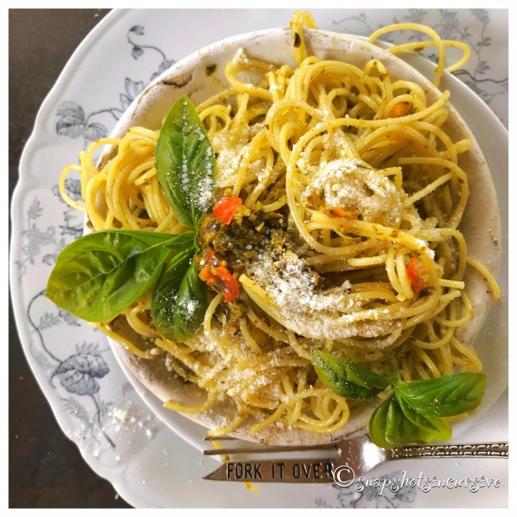 What’s Cooking in Gail’s Kitchen? Food Plating: Basil Tomato Pesto! With a vibrant basil plant that thrives in the Florida sunshine, I get to reap the benefit of having this fresh herb as often as I crave it. The hubs doesn’t care for the taste or aroma of basil, but when I add a heaping tablespoon of pesto to spaghetti sauce, he knows he likes the taste. He just can’t figure out why it seems better than usual. True confessions? I think not! My lips are sealed. I simply respond, “I’ve got the magic touch.” And leave it at that.