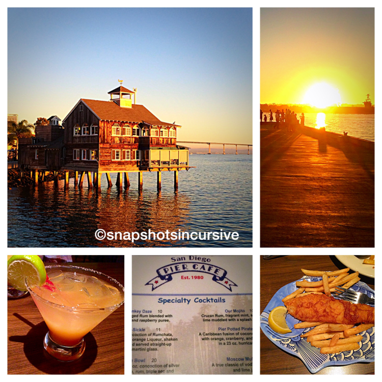 Dining Outside the Home: Seaport Village Pier Café in San Diego, California! For a charming waterfront experience with an amazing sunset view, this landmark café on the pier was a natural choice. The quaint New England-style wooden structure harbored a casual, yet romantic atmosphere. The automatic choice for a late-night dinner was the fresh catch of the day: Flaky batter-fried fish fillets and crunchy golden chips. The tangy tartar sauce and malt vinegar satisfied the taste buds. As the sun dipped below the shadowed horizon, we quenched our thirst with the ultimate refreshment, a Grand Marnier margarita.