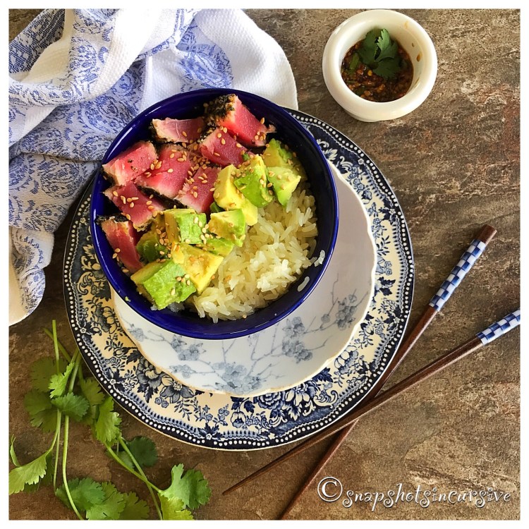 What’s Cooking in Gail’s Kitchen? Uplifting Aromas: Tuna Sushi Tower! Poke is very quickly becoming a popular food to eat at home or when dining out. I became quite a fan while wintering on the island of Kauai. Eating fresh fish and seafood became as natural as a daily walk along the beach. The secret to good poke is buying sashimi-grade tuna, since it is eaten raw. Poke translates to “chunk” in the Hawaiian language. Basically, raw fish is cut into chunks and marinated. Choosing fresh tuna over frozen is the most favorable option, so always have a chat with your seafood specialist to learn how they supply it. If frozen, be sure each portion is individually vacuum packed. Always allow it to thaw in the refrigerator. After that, the difficulty is in deciding which way to prepare it.