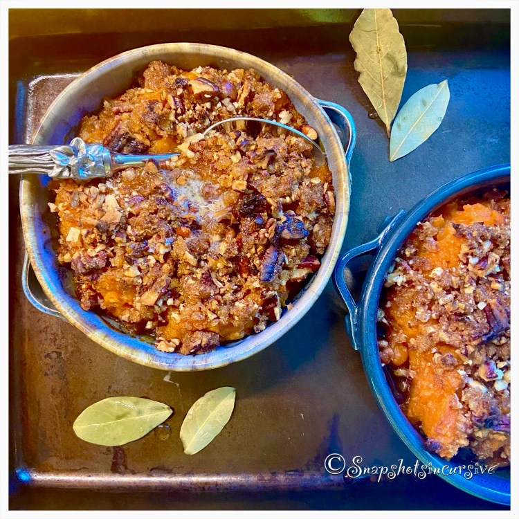 What’s Cooking in Gail’s Kitchen? A Symphony of Flavors: Bourbon Yams! As if we needed another excuse to eat yams. Their flavor alone is practically permission to devour sweets with that hint of vanilla bean. Amirite? I especially like the buttery crunch of pecans. Next time add some bourbon to the mashed potato combo. I promise you, it will totally elevate the experience. Like I said, Dessert.