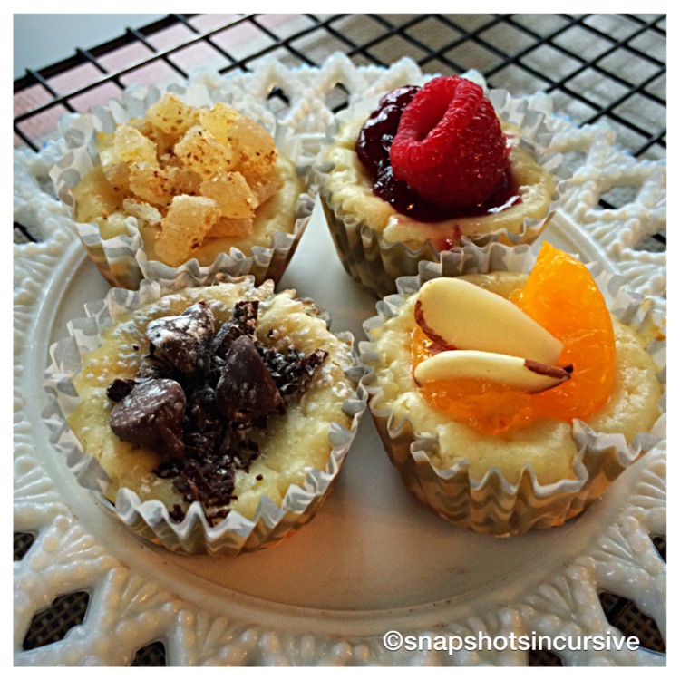 What’s Cooking in Gail’s Kitchen? Delicious Holiday Foods: Quick-Set Party Cheesecakes! You’re stopping by a friend’s house later on and were asked to bring something delish. These miniature cheesecakes are super-easy and can be whipped up in a few minutes first thing in the morning. They refrigerate while you’re at work or the gym, so no worries there. Top with fresh fruit, seedless jam, chocolate bits, or candied ginger. Dust with powdered sugar for a professional finish. Another one-bite wonderful dessert can be found in the Fruit Tart recipe at the following link.