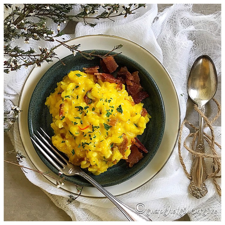 What’s Cooking in Gail’s Kitchen? The Clean Plate Club: White Cheddar Bacon Risotto! Risotto. Seeing it on the menu always makes my heart palpitate a little faster. I once asked a chef his secret to creamy risotto. He confessed he cooked it part way and froze it until a customer requested it that night. He said with a wink, “That way, I only have to stir it til half my arm falls off.” Thank goodness my rice cooker knows no difference. If you must know, I had more difficulty coughing up the cost for saffron threads, the most expensive spice in the world. Once I understood that it is grown around the Mediterranean, in the Middle East, and in India, I began to see why it was such a labor-intensive crop. Saffron comes from a Fall flower and it takes more than 80,000 crocus flowers to process one pound of saffron. Perhaps that is why the taste is worth the price.