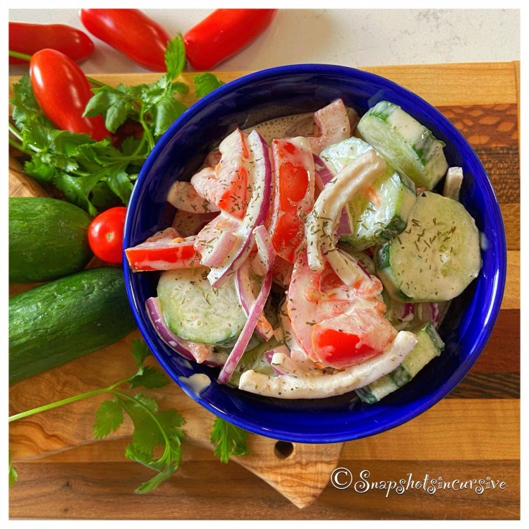 What’s Cooking in Gail’s Kitchen? Food Plating: Onion Cucumber Tomato Salad! Here’s a creamy salad that makes your meal-planning easy. Anyone who has had a garden will tell you it’s a no-brainer and goes with practically any meal you have planned. Farmers Markets typically have an abundance of these ingredients, should you choose to visit them instead. There’s a debate over whether to salt the vegetables as you layer them or simply add it to the dressing ingredients. I’ve done both. The way I presented it here allows a thicker dressing. Salt will draw out the water in the cucumbers and tomatoes, making the dressing thinner. It also enhances the taste of the veggies, so you be the judge.  In any event, keep a spoon handy. You’re going to want to slurp the dressing in the bottom of the bowl anyway.