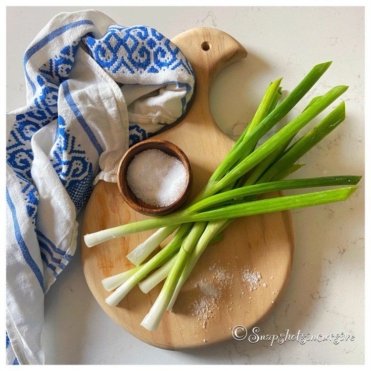 Wash the green onions thoroughly, removing any wilted leaves from the outer layer. Trim the white root ends where the bulb is formed. Angle cut the green stalks at the opposite end. Place a bowl of coarse sea salt nearby. To eat, dip the white end of the green onion into the sea salt. Take a crunchy bite. Repeat until the entire green onion is consumed.