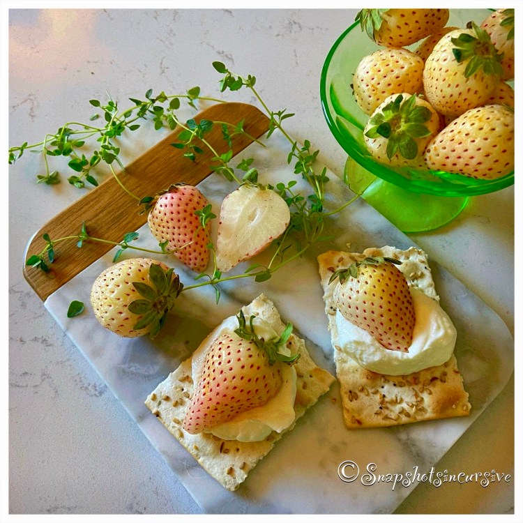 What’s Cooking in Gail’s Kitchen? Food Plating: Pine Berry Appetizer! If you are a strawberry lover, think outside the box with a tropical twist this unique berry carries. The texture remains sweet and juicy, yet highlights subtle notes of pineapple, pear, and apricot. The creamy white flesh is an indication the berry is ripe enough to eat. I only mention that because on first glance you may suspect I am trying to encourage you to eat underripe strawberries. I think not. The “seeds”, so to speak, should appear red in color. For those who wonder, pine berries are the natural result of cross-pollination. This often does make them a little more expensive than regular strawberries. For special occasions, they are perfect!