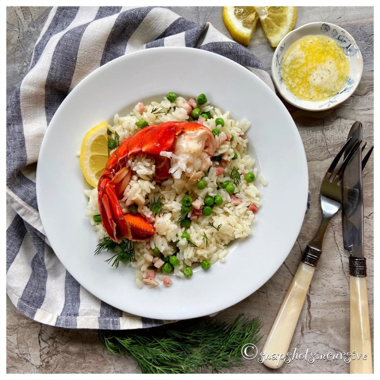 What’s Cooking in Gail’s Kitchen? Cheerful Choices: Lobster Risotto! Does anyone else smile when they hear the word “lobster”? To me, lobster looks good whenever someone is eating it. Think about it. In a restaurant you’re often draped with a disposable plastic bib that has a giant red lobster printed on it. Talk about drawing attention to yourself. “Look at me! I’m eating Lobstah! Bet you wish you were. More butter, please.” It doesn’t matter how big a mess you make, the bib gives you a pass. And just so you know, you can buy these on the internet, so the same feelings apply at home. I. Love. Lobster. 🦞