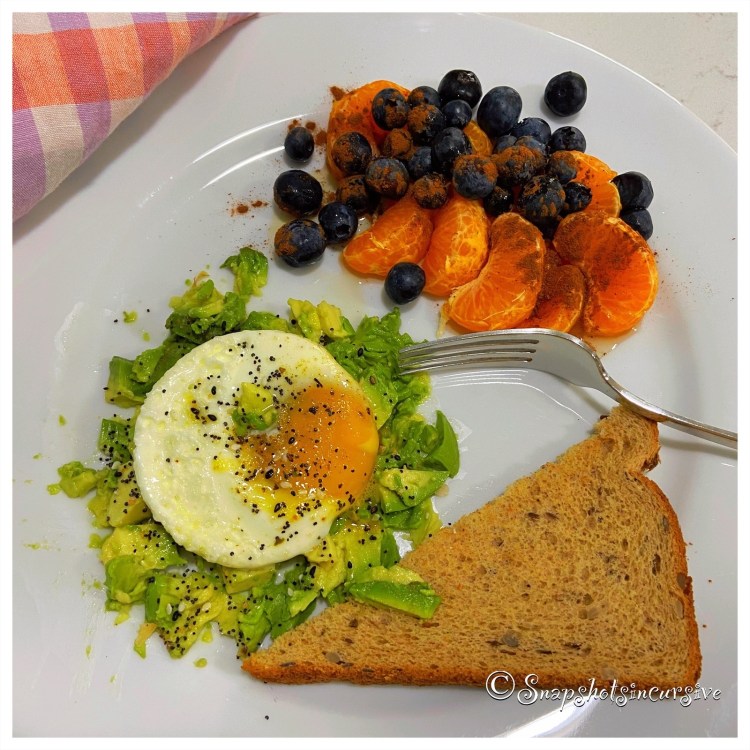 Mash the avocado, drizzle with lime juice, and spread onto the toasted bread, or simply use the toast to “dip” into the avocado/egg mixture. Spice it up with everything but bagel seasoning. Toss fresh blueberries and orange segments. Sprinkle with cinnamon. Quick and Tasty!