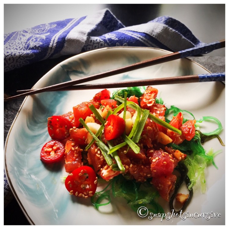 What’s Cooking in Gail’s Kitchen? Start Smart: Tuna Tartare with Seaweed! Do you wrinkle your nose when you hear the word “raw”? Some people get a little squeamish. How about if you see the word “sushi”? My grandkids’ eyes light up and their mouths begin to salivate. See the difference? “Tartare” is a fancy word for raw meat or seafood. In Hawaii, you may see the words “Ahi Poke”, which is a healthy raw tuna dish made with the best tuna right out of the sea. By adding a mixture of ginger, garlic, sesame oil, and red pepper flakes, the flavor becomes incredibly irresistible. Check out the closest Asian Deli to pick up a container of ready-to-serve seaweed salad. It’s already marinated in a delicious sauce. Together on a plate, you’ve just created a masterpiece.