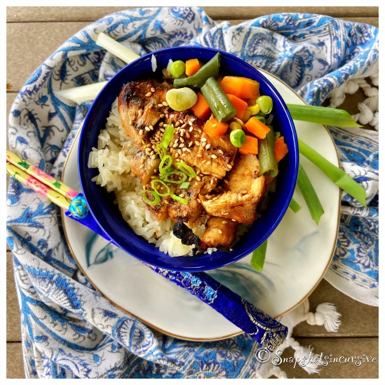 What’s Cooking in Gail’s Kitchen? Palatable Possibilities: Teriyaki Chicken Bowl! Do-ahead meals take a little bit of planning, but the “devil is in the details”, they say. In this case it means, make sure the chicken breasts are thawed AND marinated 24 hours before you plan on serving them. I realize that requires the cook to be somewhat organized. Pantries don’t stock themselves. There’s nothing worse than trying to make a dish without all the ingredients. Take sesame oil, for example. I find it absolutely delicious because it adds an earthy nuttiness to Asian food. Vegetable oil tastes meh, in my opinion. Not only does it alter the taste, the texture will be different. When I can find it, I buy toasted sesame seeds so I don’t have to worry about toasting them on the stove or in the oven. That’s 10 minutes I could be planning tomorrow’s meal. Idiosyncratic, but true.